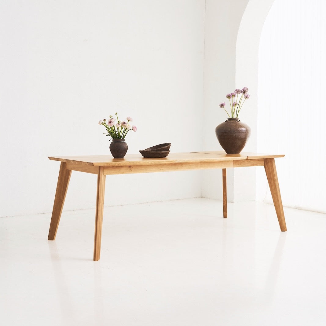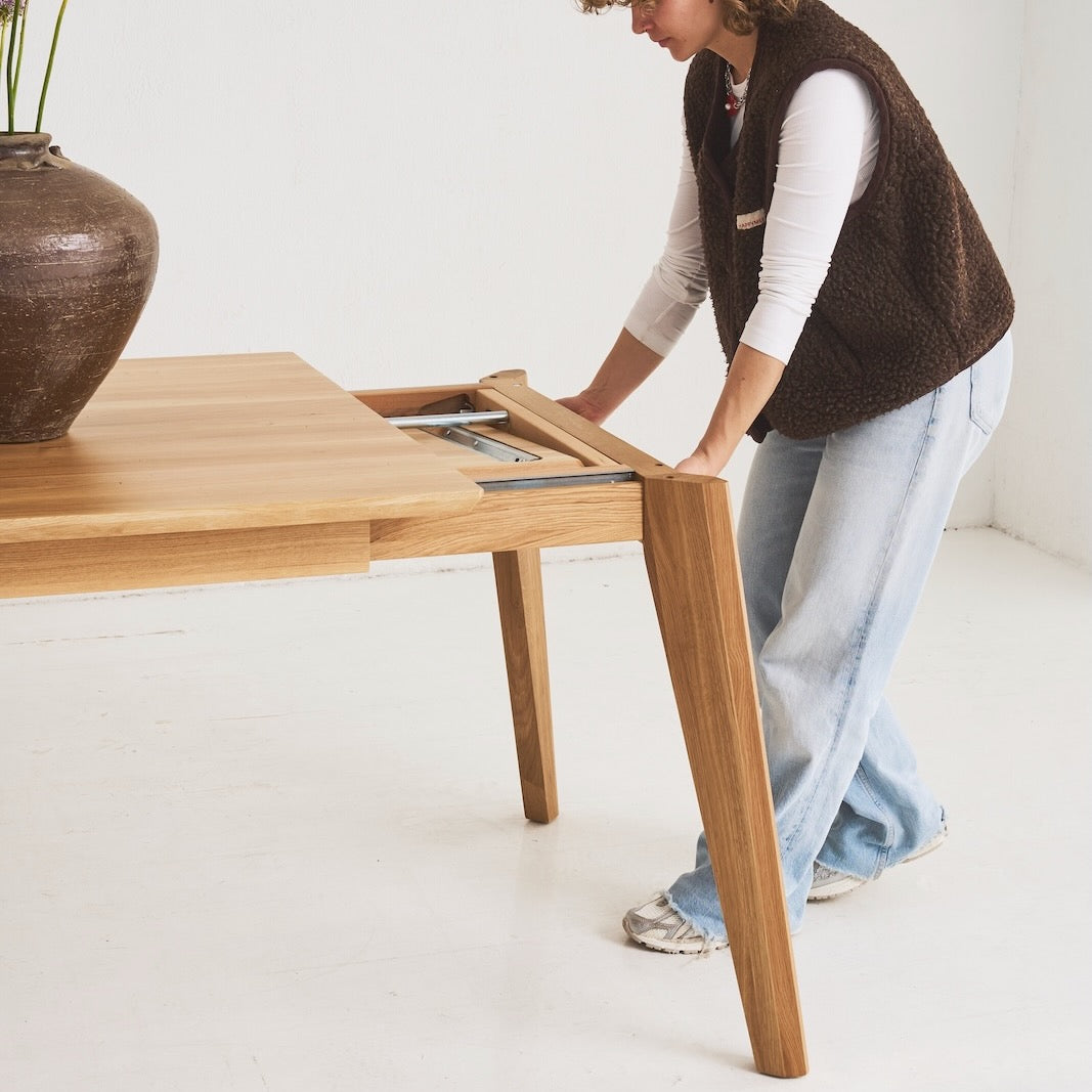- In the version with two extension leaves, the table can be extended with either one or two leaves, depending on your needs, without the necessity of extending it to its full length.