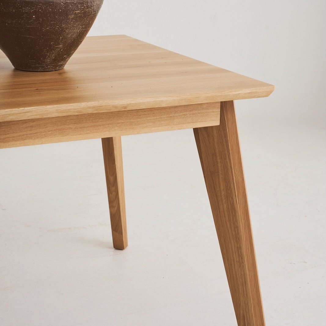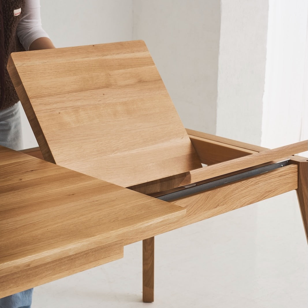 - The extension leaves are stored under the tabletop, making them easy to access and eliminating the need for separate storage.